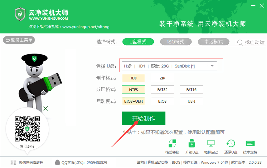 1.下载载并且运行云净U盘启动制作工具,插入u盘等待软件成功读取到u盘之后,点击制作U盘启动盘。